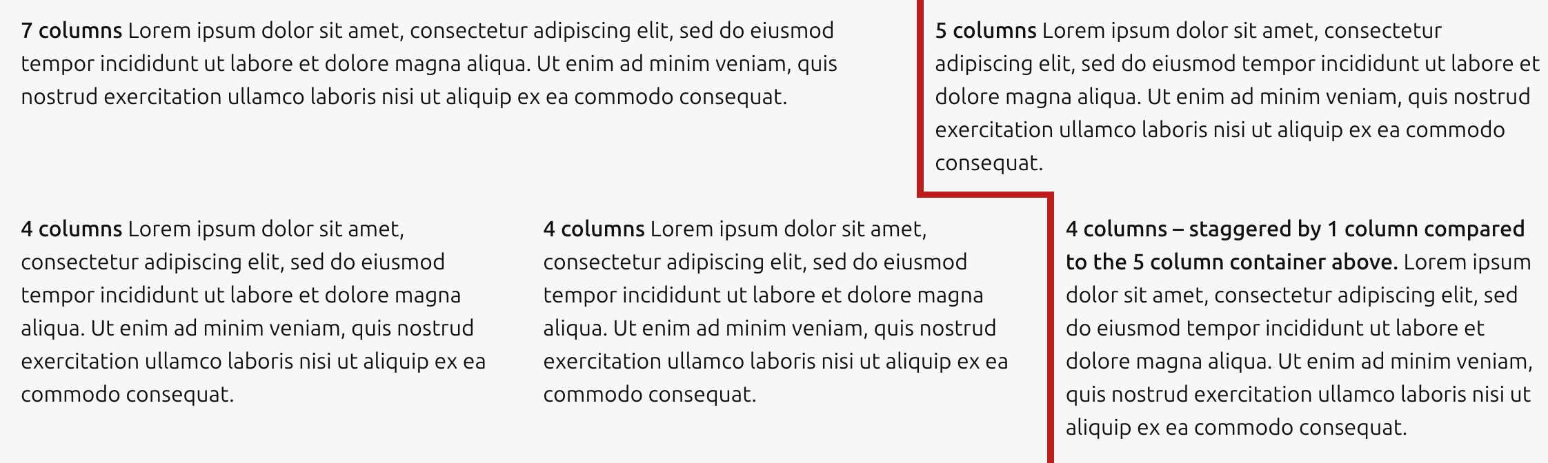 To illustrate the problem, consider the following example. Place a 5 + 7 column layout followed by a 3 + 3 + 3 column layout with placeholder content. You should get something like the image below. The problem is, containers on the far right are staggered by one column, which looks like an unintentional misalignment:
